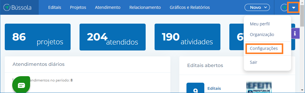 Para cadastrar o tipo de ocorrência, clique na seta para baixo do lado do nome > Configurações