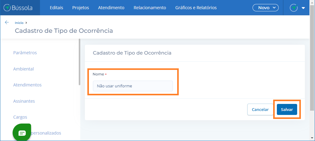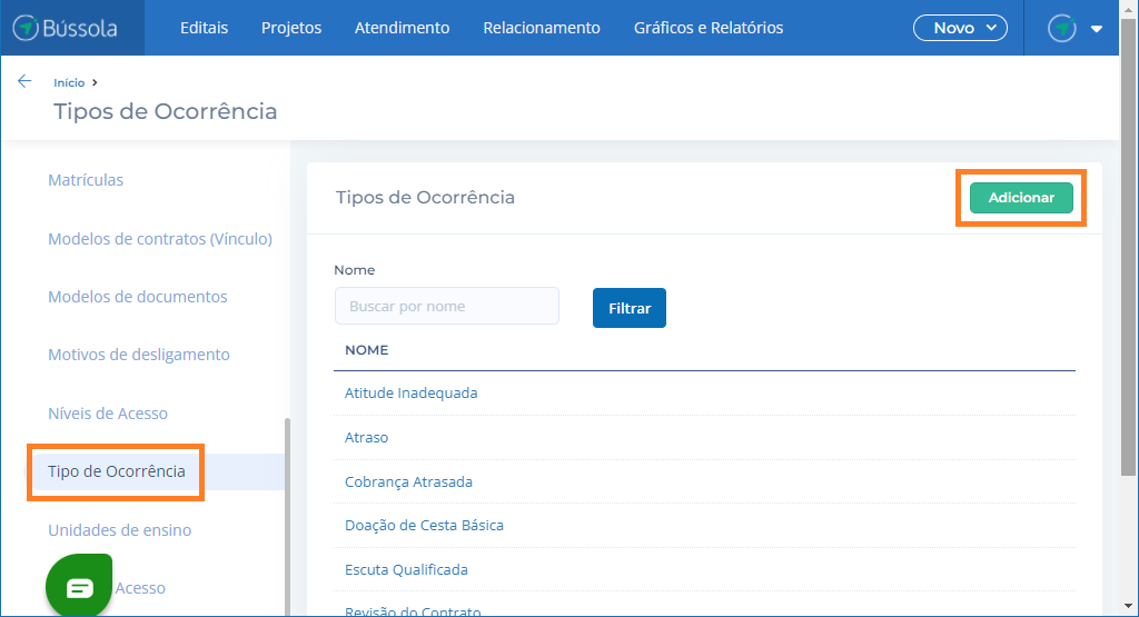 Clique na aba: Tipo de Ocorrência, clique em: Adicionar