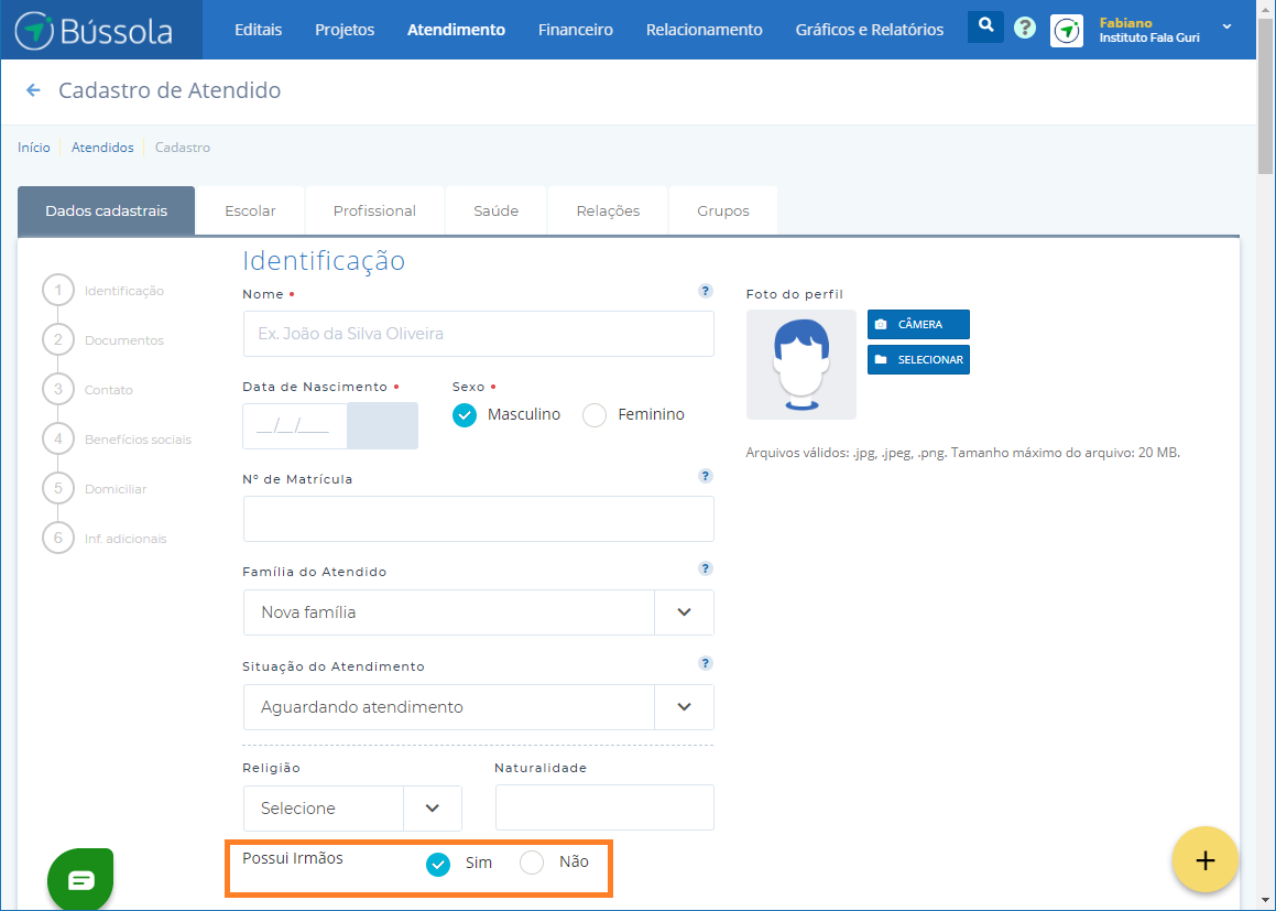 Após criar o campo personalizado para pessoa, o mesmo é exibido entre as áreas de cadastro do atendido, irá depender também em qual aba você vai solicitar a informação (Dados cadastrais, Escolar, Despesas, Profissional, Saúde, Relações ou Domiciliar), conforme mostra a imagem abaixo: