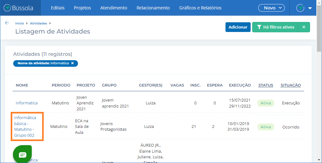 Na parte de baixo da página tem a lista de atendidos inscritos na atividade, na linha com o nome do atendido, clique em: Detalhes