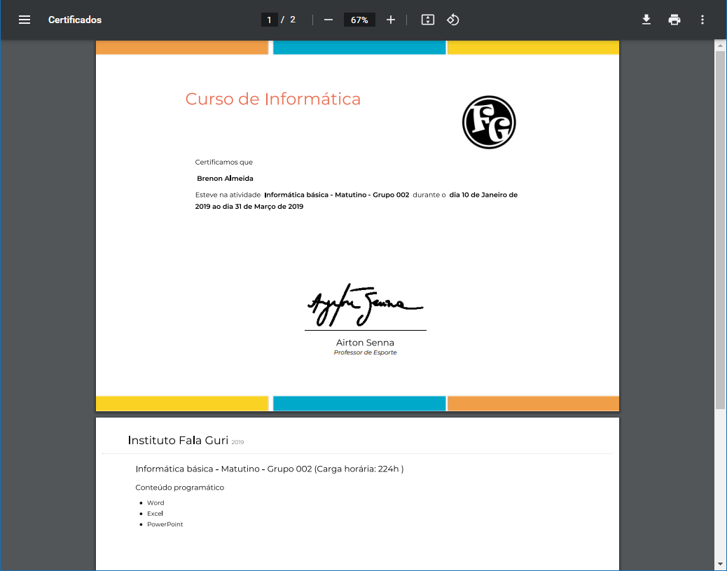Será gerado um documento PDF com o certificado que foi configurado para está atividade. Caso precise imprimir* é só clicar no ícone da impressora.
