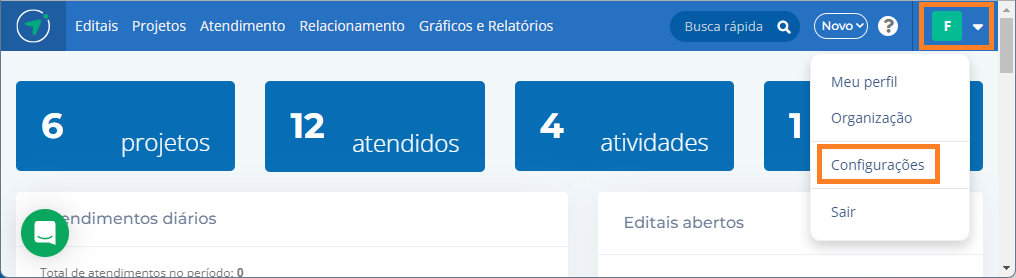 Para cadastrar a unidade de ensino, clique na seta branca > Configurações