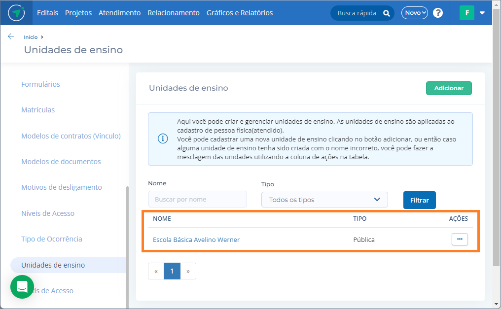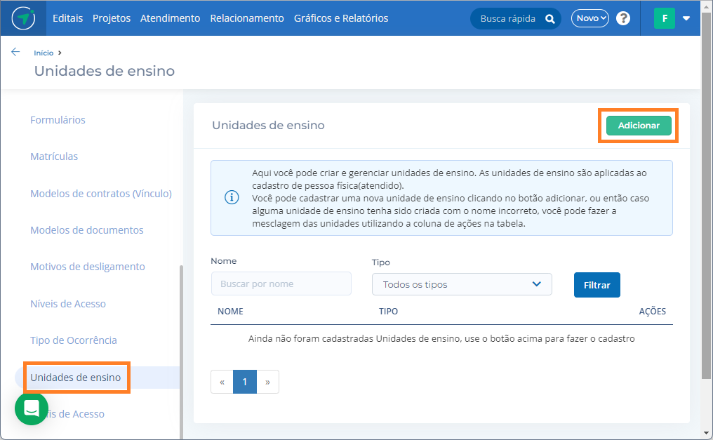 Clique na aba: Unidades de ensino e clique no botão: Adicionar