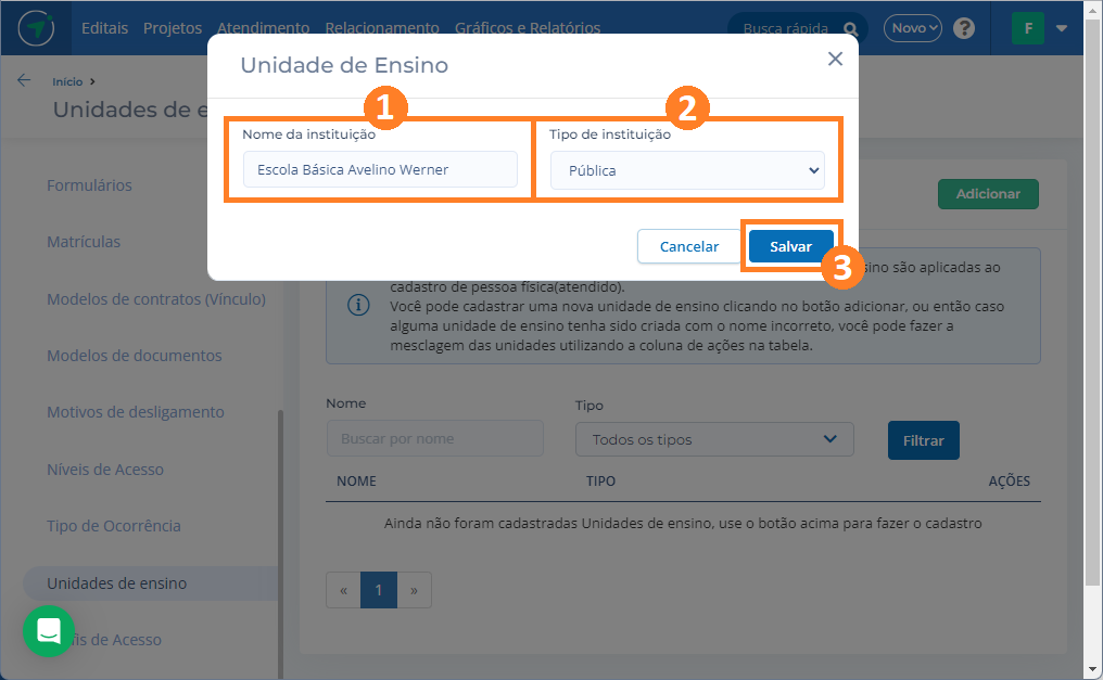 As unidades de ensino são as escolas da sua região que o seus atendidos estudam, lembre-se de cadastrar o nome completo da unidade e evitar o uso de abreviaturas.