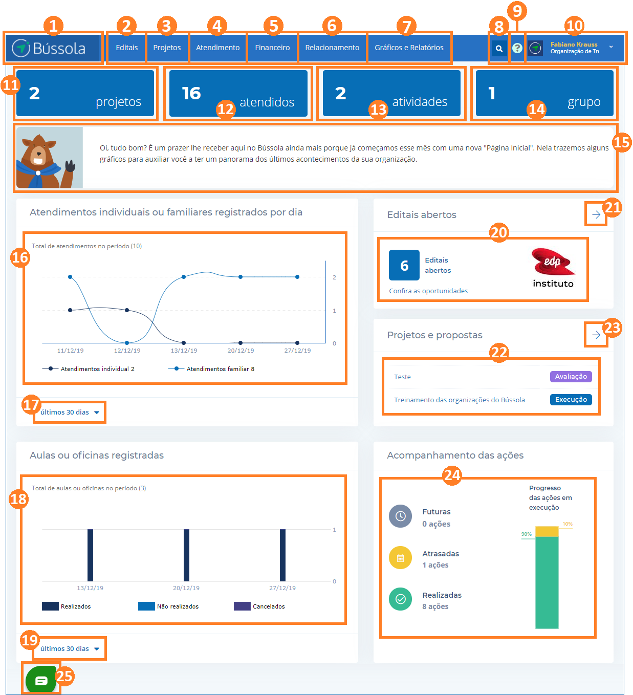 Após efetuar o login no Bússola, você verá as principais informações sobre a sua organização.