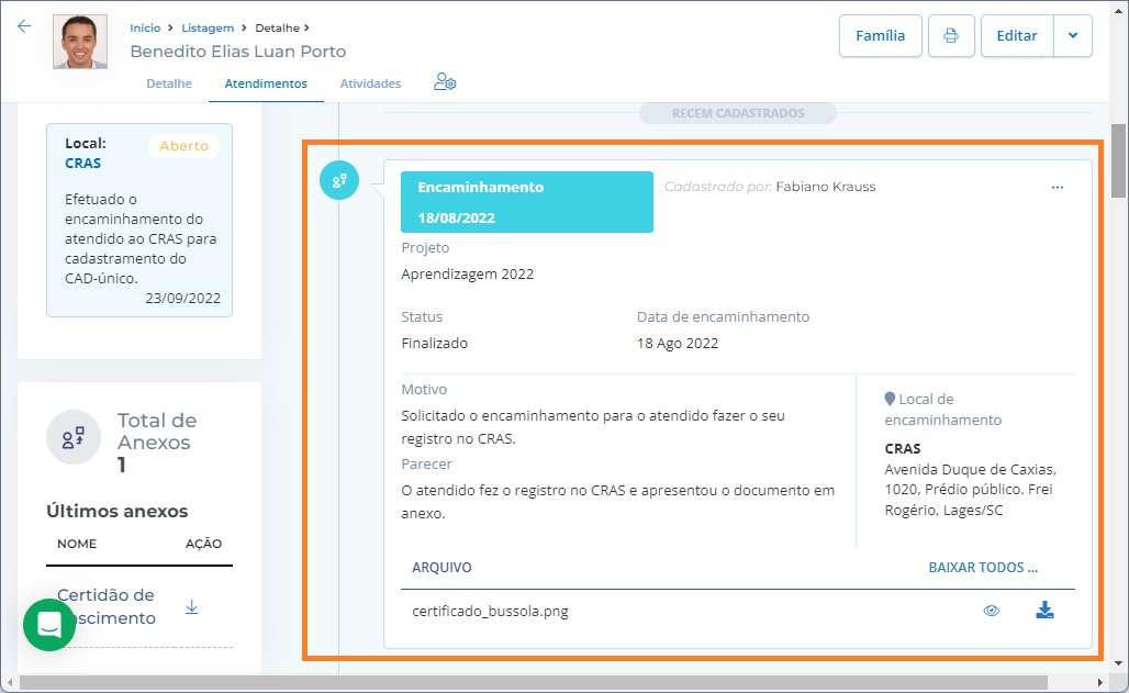 Clique no nome do atendido que você quer registrar o encaminhamento