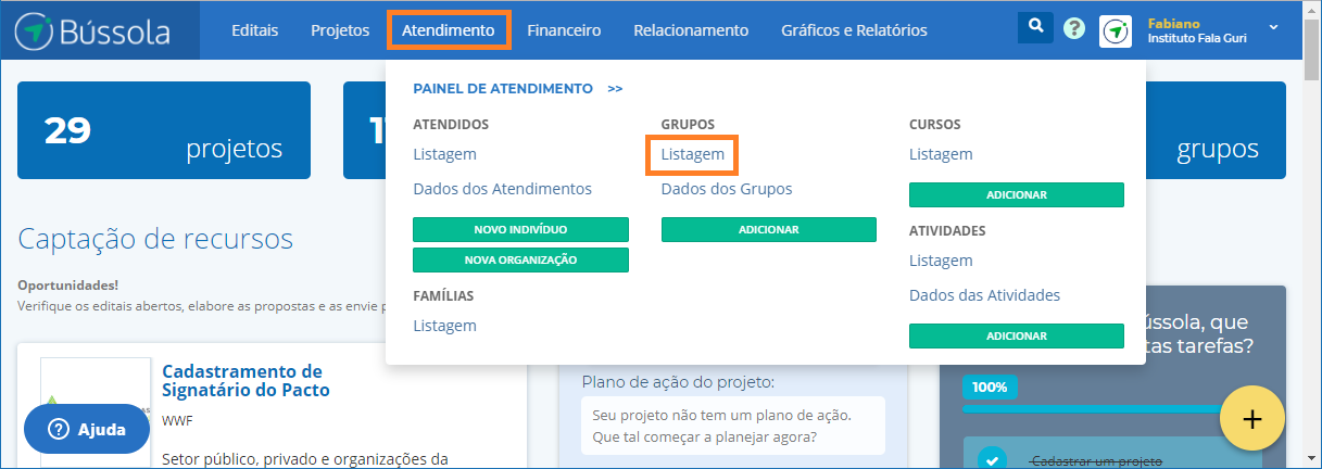 Para criar uma atividade com grupo vinculado, acesse: Atendimento > GRUPOS > Listagem