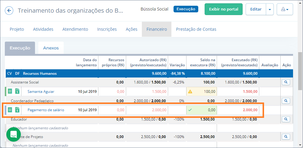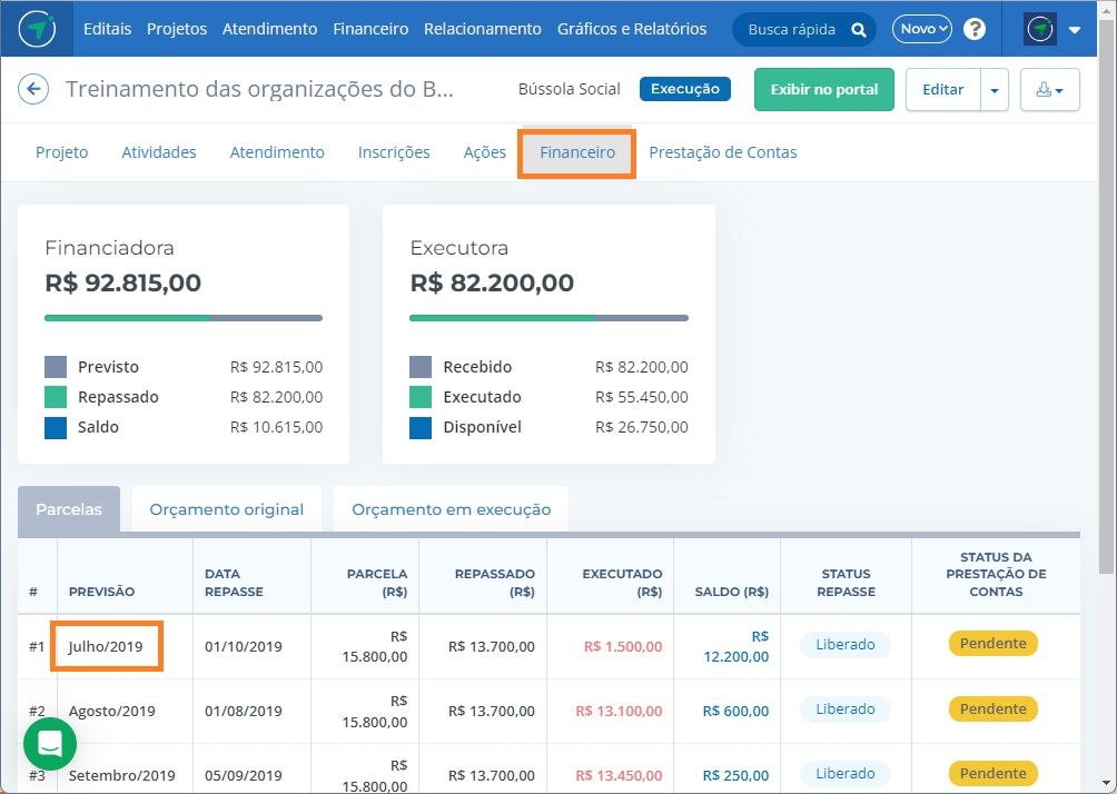 Clique na aba: Financeiro e clique no nome da parcela que está com o status de repasse: Liberado