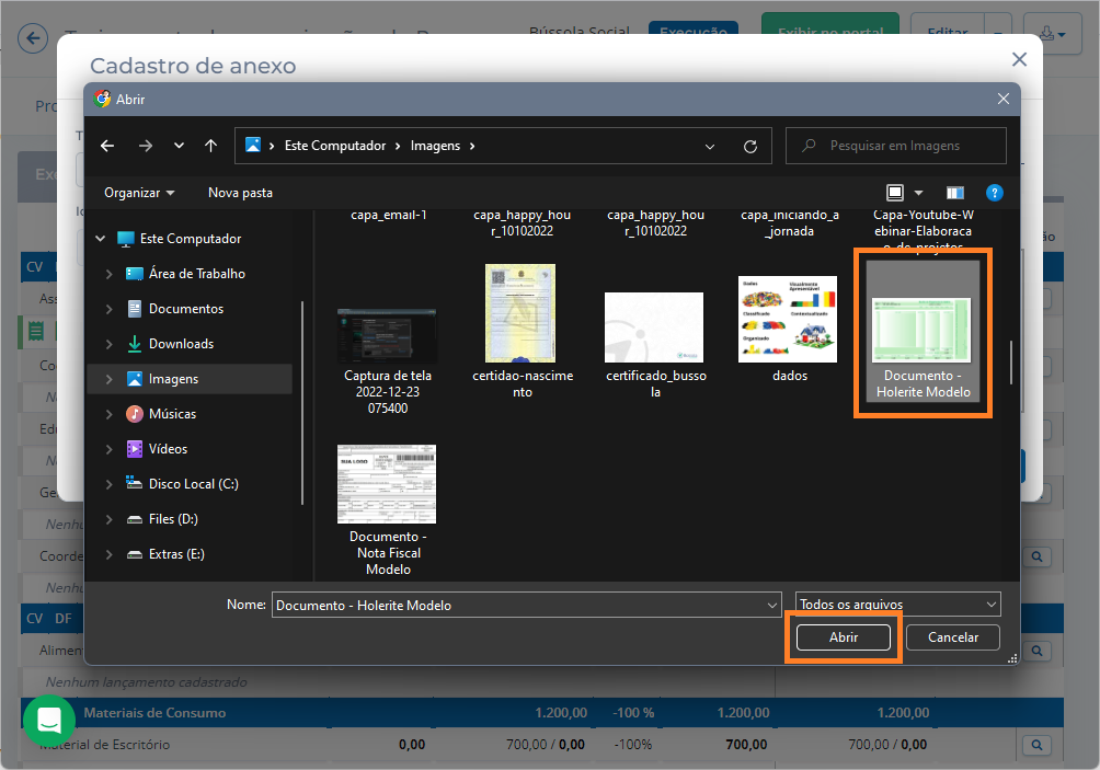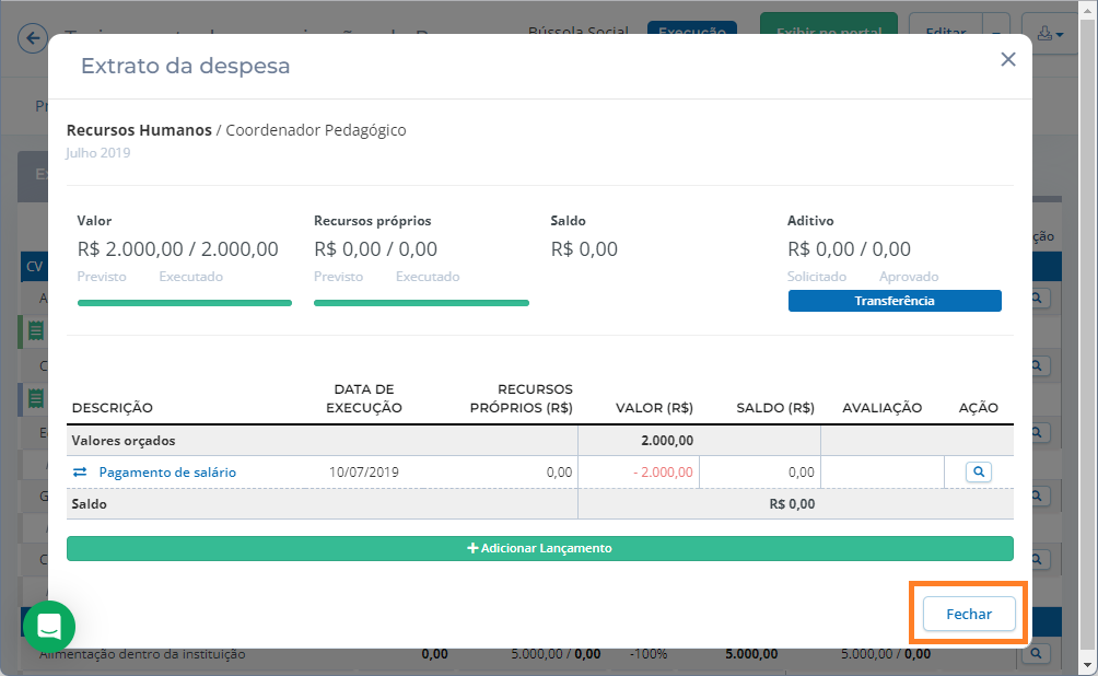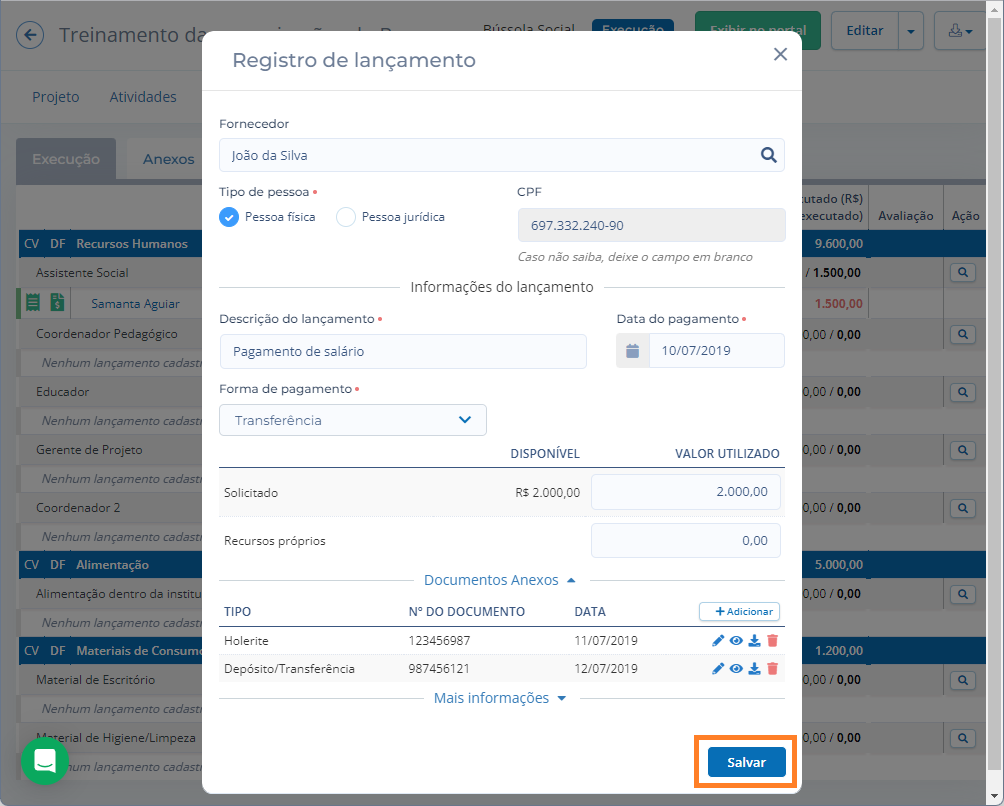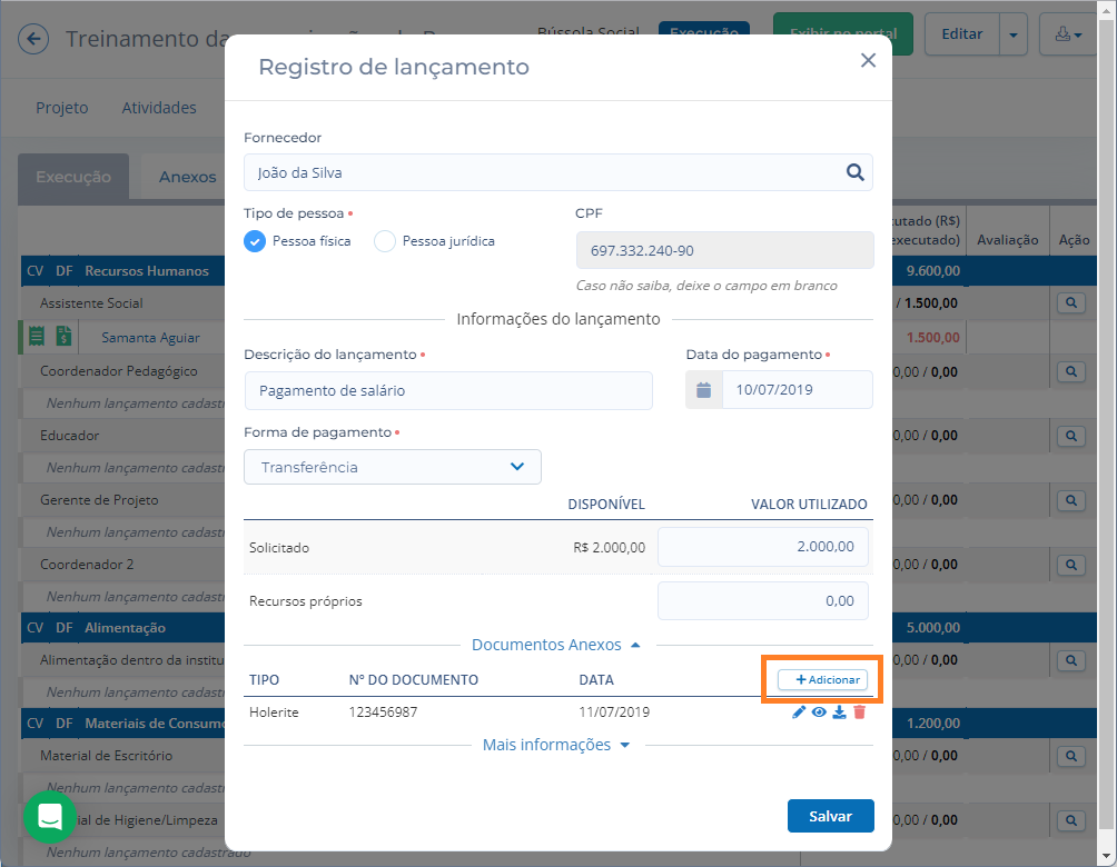 OBS: Para qualquer lançamento que você registrar precisa ser adicionado dois documentos: Documento fiscal e Comprovante. E lembrando que também não é possível gastar um valor maior do que o solicitado.