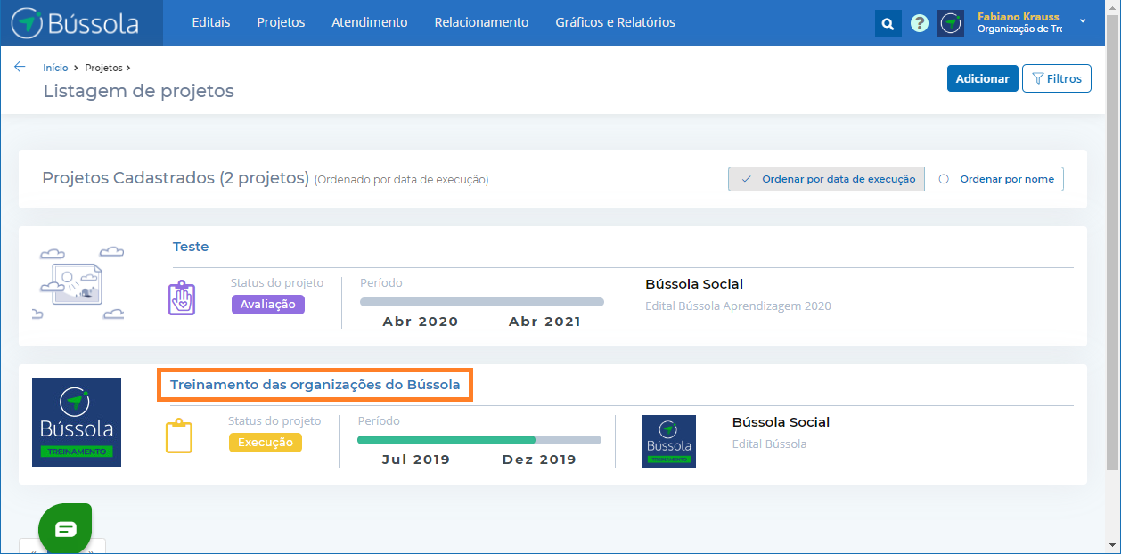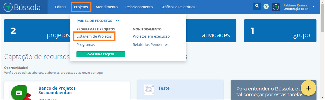 Para enviar a documentação, acesse: Projetos > PROGRAMAS E PROJETOS > Listagem de projetos