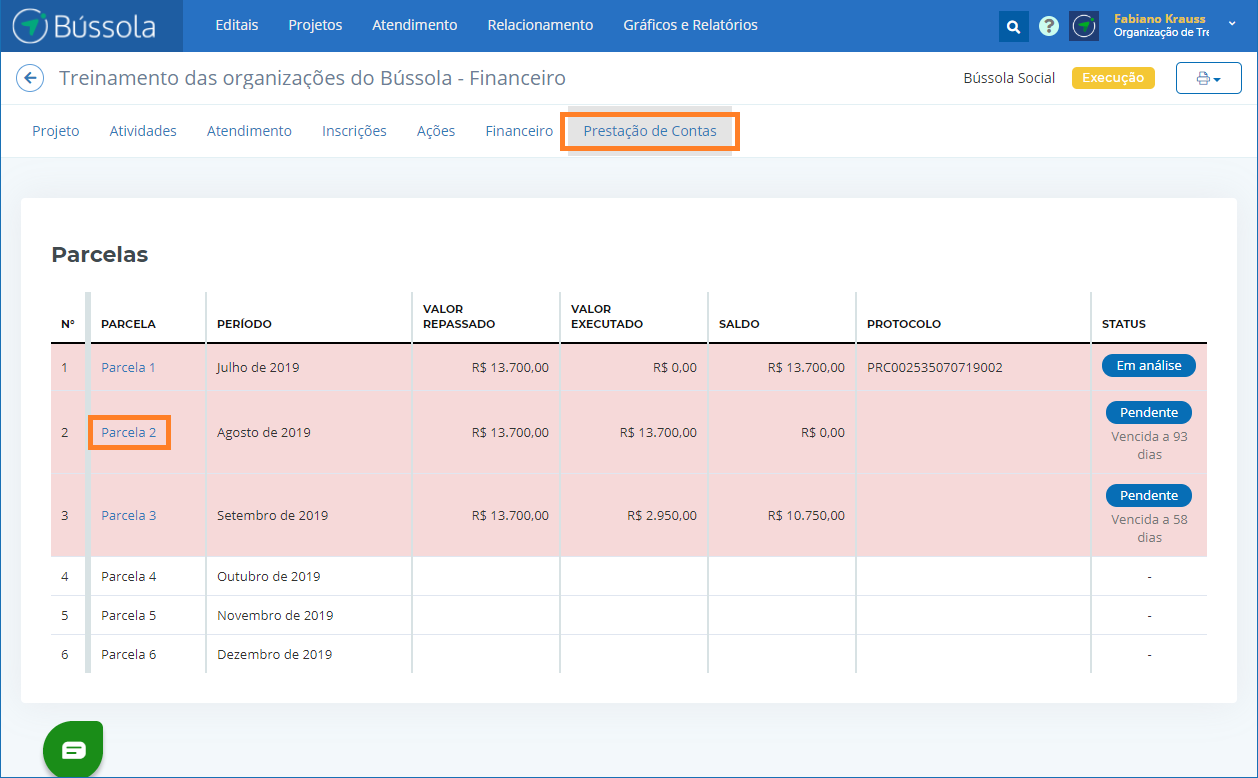 Clique na aba: Prestação de Contas e clique na parcela que você quer prestar conta
