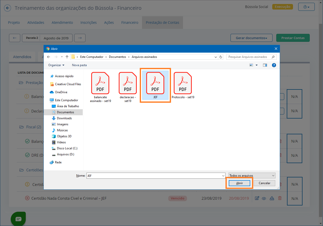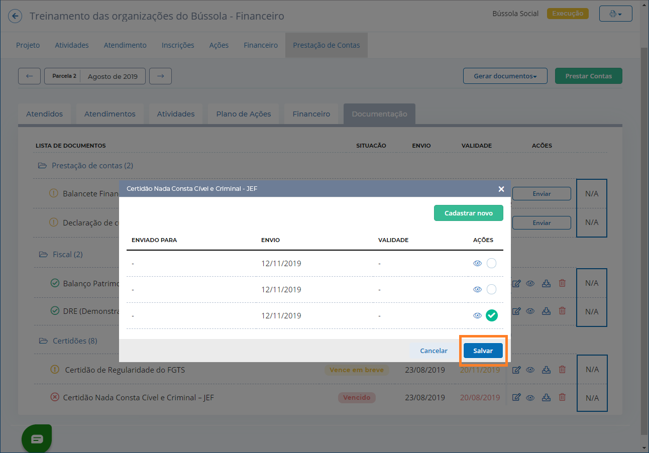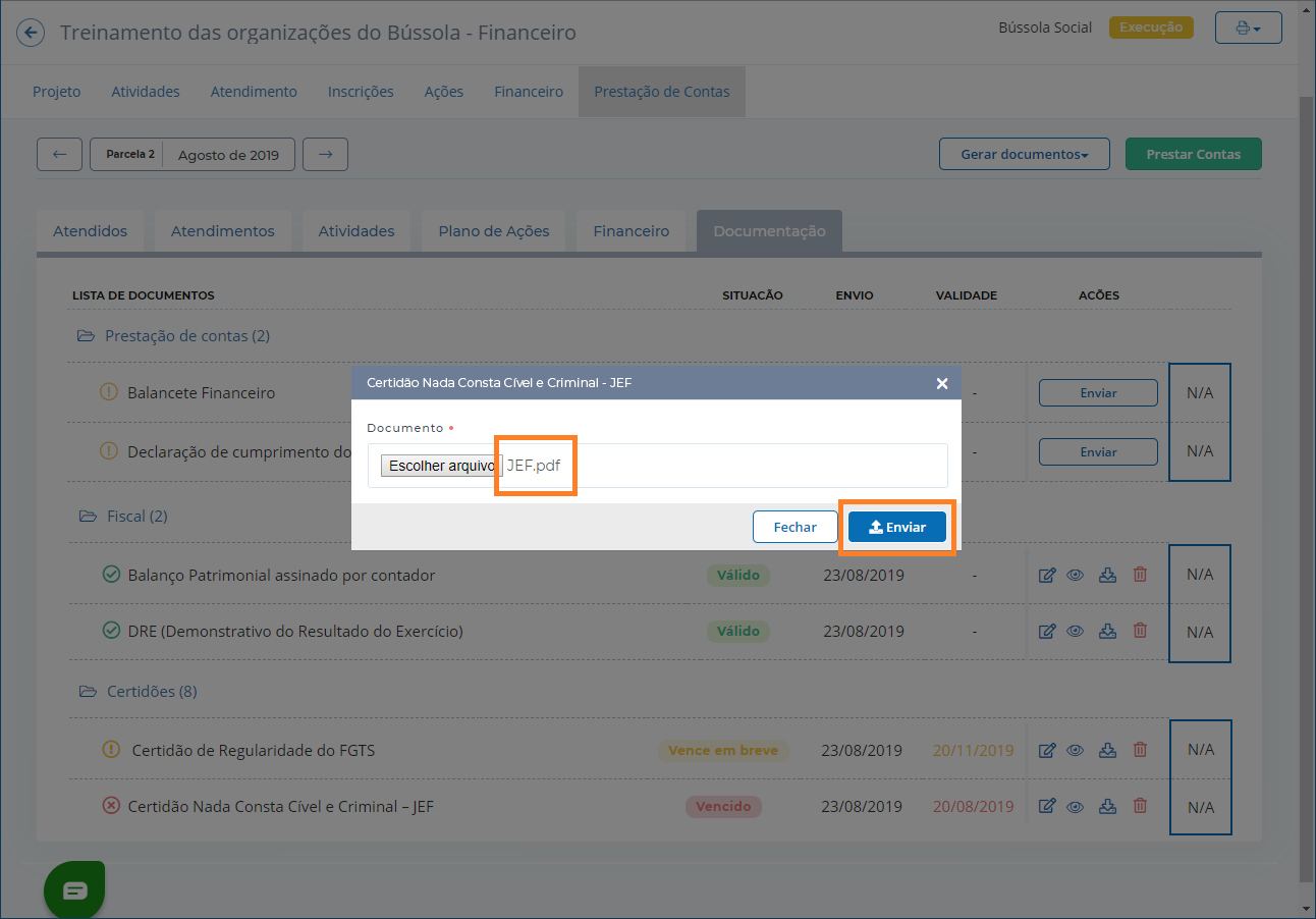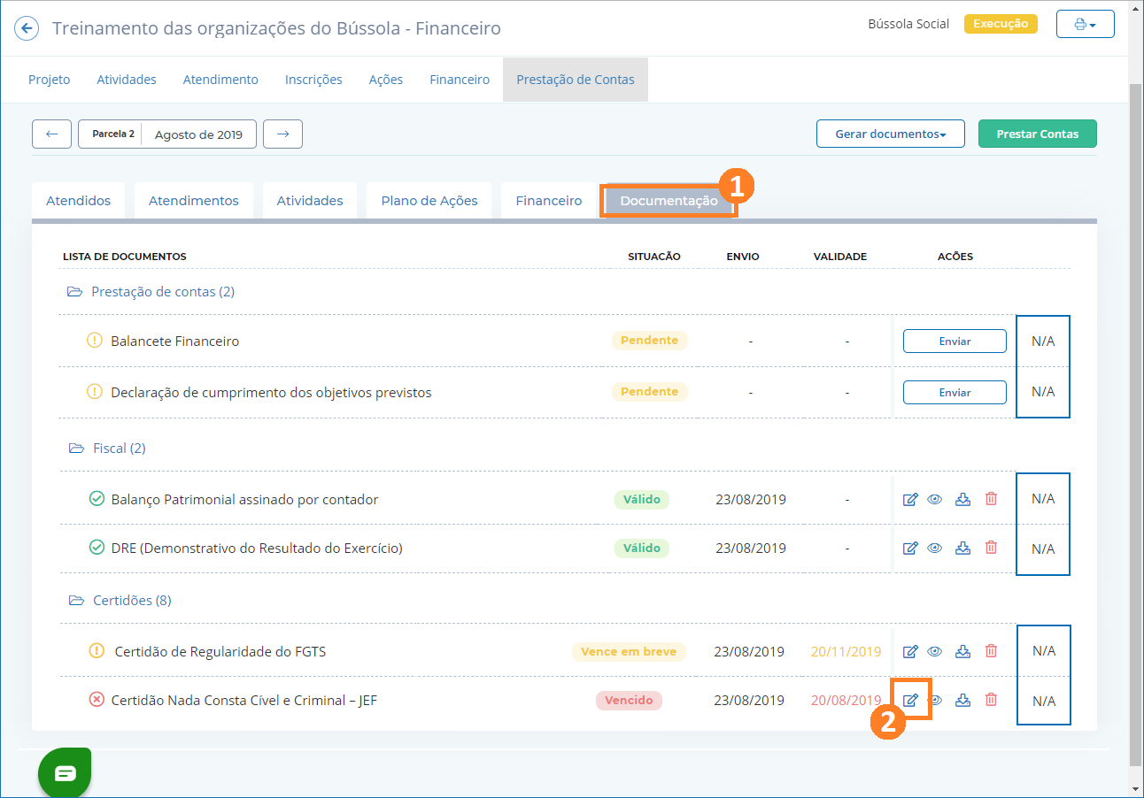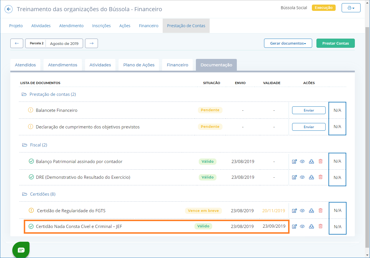 Estes documentos são os documentos que você inseriu quando participou do edital. Em todas as parcelas que você prestar contas é necessário verificar se os documento estão válidos.