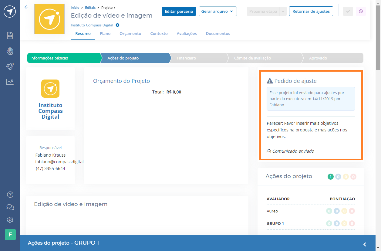 A proposta fica com a notificação Pedido de ajuste descrevendo data, pessoa que solicitou o ajuste e o parecer do que a organização precisa corrigir na proposta que ela enviou