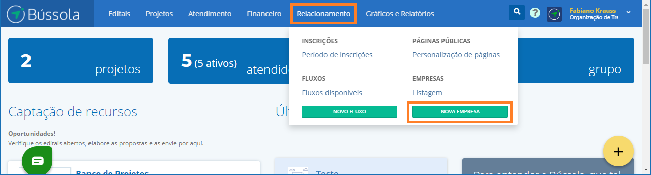 Para cadastrar uma empresa, acesse: Relacionamento > EMPRESAS > NOVA EMPRESA