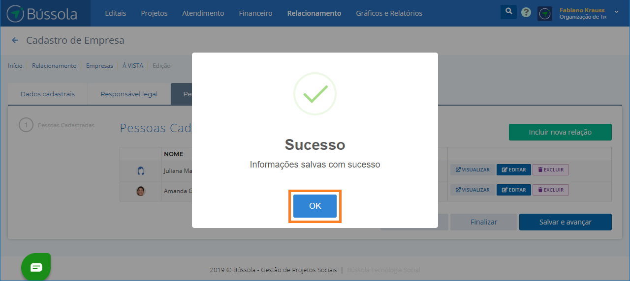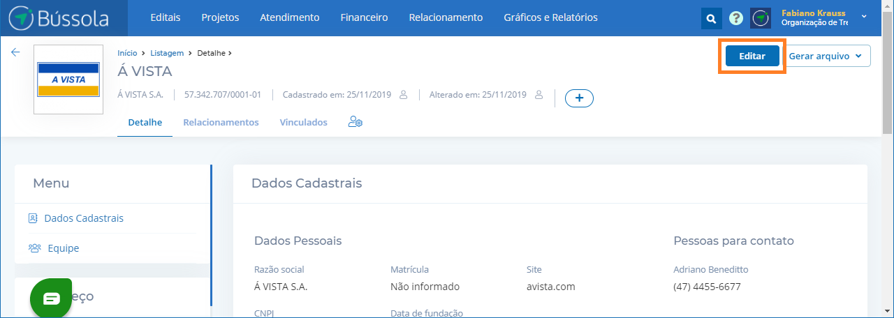Para cadastrar as pessoas da empresa, acesse: Relacionamento > EMPRESAS > Listagem