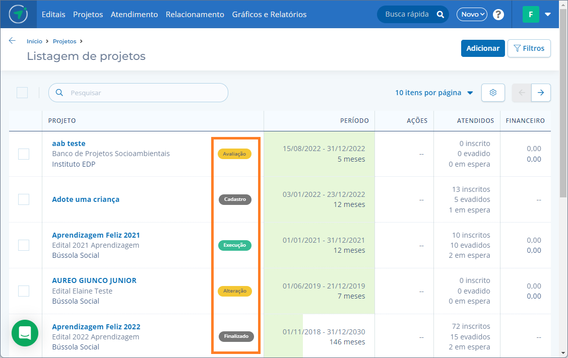 Para acessar o status do projeto, acesse: Projetos > Programas e Projetos > Listagem de Projetos