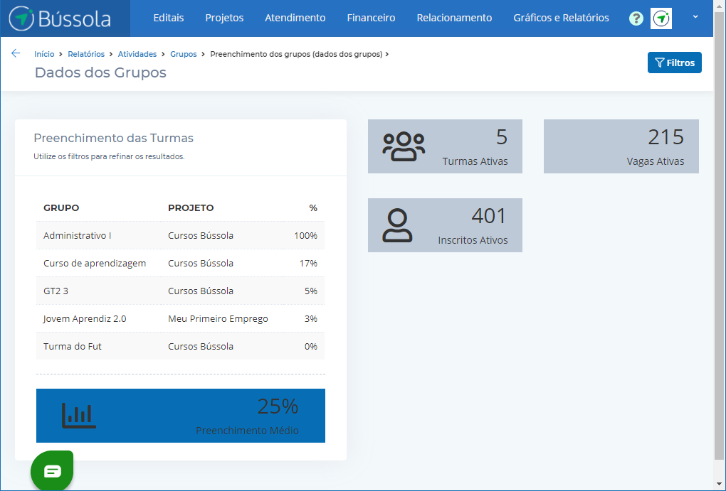 Este relatório exibe as informações de do nome do grupo, o projeto que o grupo pertence, a porcentagem de inscritos no grupo, o preenchimento médio em relação a todos os grupos, o número de grupos ativos, o número de vagas ativas em todos os grupos e o inscritos ativos.